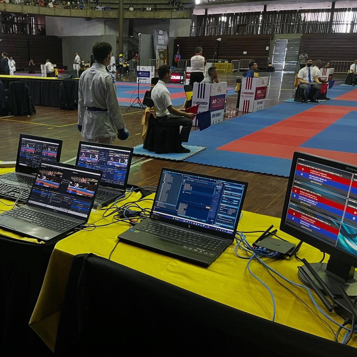 Equipamos el área de competición con paneles de puntuación y sistemas de video review de alta gama. Además contamos con personal altamente calificado en sitio durante todo el evento, brindando un soporte técnico proactivo que garantiza la estabilidad de los sistemas y la continuidad de la competencia sin contratiempos.